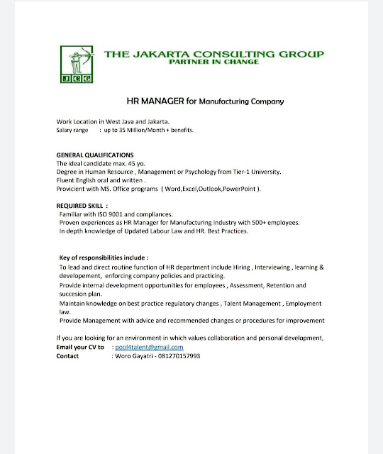 HR MANAGER - JAWA BARAT & JAKARTA